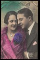 A woman gazing at a man who holds her arm; representing a romantic new year. Coloured photographic postcard, 193-.