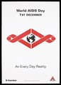 Two horizontal red ribbons surround a globe of the world representing an advertisement for World Aids Day 1st December 1994 by Hounslow Council. Colour lithograph, 1994.