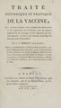 Traité historique et pratique de la vaccine. Qui contient le précis et les résultats des observations et des expériences sur la vaccine, avec un examen impartial de ses avantages et des objections qui leur sont opposées, et tout ce qui concerne la pratique du nouveau mode d'inoculation / [J.L. Moreau de la Sarthe].