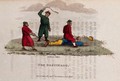 A Chinese man lying on the ground, with a man seated on his back and another holding the rope that binds his feet, is being whipped. Coloured etching by W. Milton, 1813.