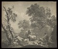 A man resting, with two horses; a herdsman looking after cattle and a goat while they drink in a pool; representing evening. Etching by T. Major, 1744, after N. Berchem.