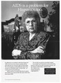 A middle-aged woman in glasses with her arms crossed, a statue of Christ in the background and a warning about the problem of AIDS for Hispanic American people; a poster from the America responds to Aids advertising campaign. Lithograph.