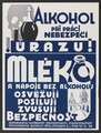 A skull, a tumbler of beer and a bottle of alcoholic drink; advertising the danger of alcohol as a cause of industrial accidents in Czechoslovakia, and contrasting it with milk. Colour lithograph, 193- (?).