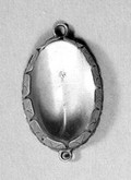 Pilgrim's token, a blue bottle showing a little chapel. Formerly contained St. Wolfgang's water. The bottle was covered with water-paint in order to show the design, when the lantern slide was made.