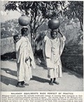 Two Malagasy women carrying waterpots on their heads; the woman on the left also carries a child on her back. Halftone.