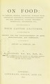 On food : its varieties, chemical composition, nutritive value, comparative digestibility, physiological functions and uses, preparation, culinary treatment, preservation, adulteration, etc. being the substance of four cantor lectures delivered before the society for the encouragement of arts, manufactures, and commerce, in the months of January and February, 1868 / by H. Letheby.