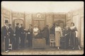 French or Belgian prisoners of war, some in drag, posing on stage during a crowded scene of "La dame aux camélias"; at Sennelager prisoner of war camp in Germany. Photographic postcard, 191-.