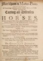 Markham's master-piece containing all knowledge belonging to the smith, farrier, or horse-leach, touching the curing all diseases in horses. Drawn with great pains from approved experience, and the publick practice of the best horse-marshals in Christendom. Divided into two books. The I. containing cures physical : The II. all cures chirurgical. Together with the nature, use, and quality of every simple mentioned through the whole work. Now the sixteenth time printed, corrected, and augmented, with above thirty new chapters, and forty new medicines heretofore never publish'd . To which is added, the exactest receipts for curing all diseases in oxen, cows, sheep, hogs, goats, dogs, and all smaller cattle. Also the compleat jockey ; containing methods for the training horses up for racing ... To which is added ... directions to preserve all sorts of cattle, from all manner of diseases ... / [Gervase Markham].