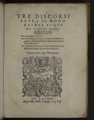 Tre discorsi sopra il modo d'alzar acque da' lvoghi bassi. Per adacquar terreni. Per levar acque sorgenti ... dalle campagne ... Per mandare l'acqua da bere alle citta / [Giuseppe Ceredi].