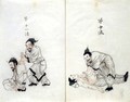 A chiropractor treating a patient. Taken from a emakimonos, or horizontal scroll, in the Shijo style.