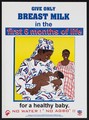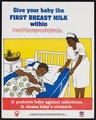 A mother breast feeds her baby as another woman looks on: promoting benefits of breastfeeding in Nigeria. Colour lithograph by Wellstart International and Johns Hopkins University/Population Communication Services, ca. 1994.