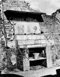 Partly ruined buildings in Ostia identified as a tavern or hot-food shop (thermopolium) from the 3rd century AD: a fresco depicting vegetables, wine and fruit, seen from the front; marble steps descend below. Photograph after G.E. Chauffourier, 1928.
