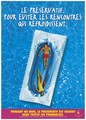 A man and a woman lying in swimsuits within a condom packet within a swimming pool representing an advertisement for safe sex by the Ministère de la Santé, Division de la Médicine Préventive. Colour lithograph.