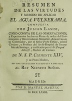 Resumen de las virtudes y metodo de aplicar el agua vulneraria / compuesta por Julian Landi. Public Domain Mark. Source: Wellcome Collection.