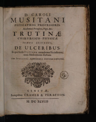 Chirurgia theoretico-practica, seu trutina chirurgico-physica, in IV tomos divisa ; in quibus omnium morborum ad chirurgiam spectantium causae, signa, prognoses, et sanationes nuperis experimentis, novisque observationibus, et medicamentis ... probatis proferuntur / [Carlo Musitano].