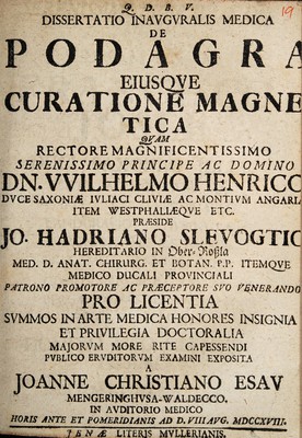 Credit: Dissertatio inauguralis medica de podagra eiusque curatione magnetica ... / [Johann Christian Esau]. Source: Wellcome Collection.