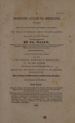 A domestic guide to medicine .... To this is prefixed a few remarks on the universal domestic medicine of the author, (formerly the Improved Hygeian Pills); showing that this medicine is founded on the prevailing doctrines of the Brit. [sic] College of Physicians and Surgeons, London / [Joseph Ralph].
