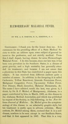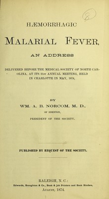 Haemorrhagic malarial fever : an address delivered before the Medical Society of North Carolina, at its 21st annual meeting, held in Charlotte in May, 1874 / by Wm. A. B. Norcom, M.D.