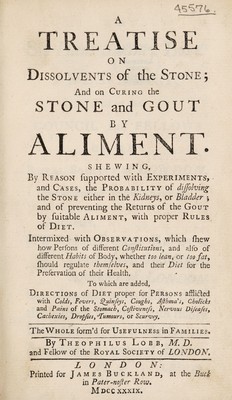A treatise on dissolvents of the stone; and on curing the stone and gout by aliment ... To which are added, directions of diet proper for persons afflicted with colds, fevers, etc / [Theophilus Lobb].