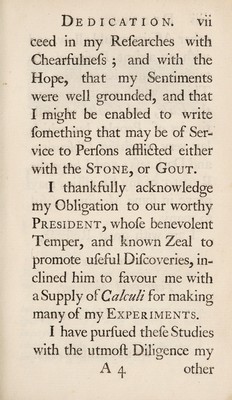 Credit: A treatise on dissolvents of the stone; and on curing the stone and gout by aliment ... To which are added, directions of diet proper for persons afflicted with colds, fevers, etc / [Theophilus Lobb]. Source: Wellcome Collection.