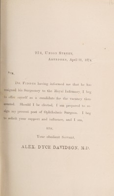 [Two letters regarding application for the post of surgeon to the Royal Infirmary dated April 21st, 1874] / Alex. Dyce Davidson.