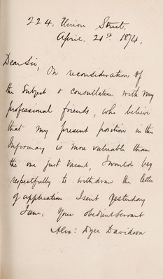 Credit: [Two letters regarding application for the post of surgeon to the Royal Infirmary dated April 21st, 1874] / Alex. Dyce Davidson. Source: Wellcome Collection.