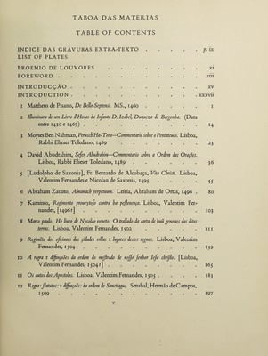 ![TABOA DAS MATEKIAS TABLE OF CONTENTS INDICE DAS GRAVURAS EXTRA/TEXTO.p. ix LIST OF PLATES PROEMIO DE LOUVORES.xi FOREWORD.xiii INTRO DUCÇÃO.xv INTRODUCTION.xxxvii 1 Mattheus de Pisano, De Bello Septensi. MS., 1460.1 2 llluminura de um Livro d’Horas da Infanta D. Izahel, Duqueza de Borgonha. (Data entre 1430 e 1467).14 3 Moyses Ben Nahman, Perusch Has Tora—Commentario sobre 0 Pentateuco. Lisboa, Rabbi Elieser Toledano, 1489.23 4 David Abudrahim, Sefer Abudrahim—Commentario sobre a Ordem das Orações. Lisboa, Rabbi Elieser Toledano, 1489.3 6 5 [Ludolpho de Saxonia], Fr. Bernardo de Alcobaça, Vita Christi. Lisboa, Valentim Fernandes e Nicolau de Saxonia, 1495 .... 45 6 Abraham Zacuto, Almanach perpetuum. Leiria, Abraham de Ortas, 1496 . 80 7 Kaminto, Regimento proueytofo contra ha peflenença. Lisboa, Valentim Fer^ nandes, [1496?].103 8 Marco paulo. Ho liuro de Nycolao veneto. O trallado da carta de huu genoues das ditas terras. Lisboa, Valentim Fernandes, 1502.hi 9 Regimeto dos ofçiaaes das çidades villas z lugares destes regnos. Lisboa, Valentim Fernandes, 1504.159 10 A regra z diffinçoões da ordem do meflrado de nojfo fenhor Iefu chriflo. [Lisboa, Valentim Fernandes, 1504?].165 11 Os autos dos Apostolos. Lisboa, Valentim Fernandes, 1505 . . . .183 12 Regra:Jlatutos: z diffinçoes: da ordem de Sanctiaguo. Setúbal, Hermao de Campos, 1509.197](https://iiif.wellcomecollection.org/image/b31364500_0001_0011.jp2/full/800%2C/0/default.jpg)