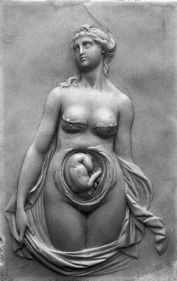 Credit: M0012185EA: Photograph of a wax plaque showing various parts of the female anatomy and embryo, in particular the foetus in uterus. Source: Wellcome Collection.