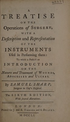 A treatise on the operations of surgery, with a description and representation of the instruments used in performing them: to which is prefix'd an introduction on the nature and treatment of wounds, abscesses and ulcers ... / By Samuel Sharp.