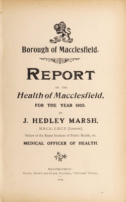 ![Borough of Macclesfield. ON THE Health of Macclesfield\ FOR THE YEAR 1903. J. HEDLEY MARSH, M.R.C.S., L.R.C-P. [London], Fellow of the Royal Institute of Public Health, &c. MEDICAL OFFICER OF HEALTH. MACCLESFIELD : Claye, Brown and Claye, Printers, “ Courier Works,. 1904.](https://iiif.wellcomecollection.org/image/b29778840_0001.jp2/full/800%2C/0/default.jpg)