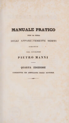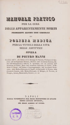 Manuale pratico per la cura degli apparentemente morti : premessevi alcune idee generali di polizia medica per la tutela della vita negli asfittici / opera di Pietro Manni.