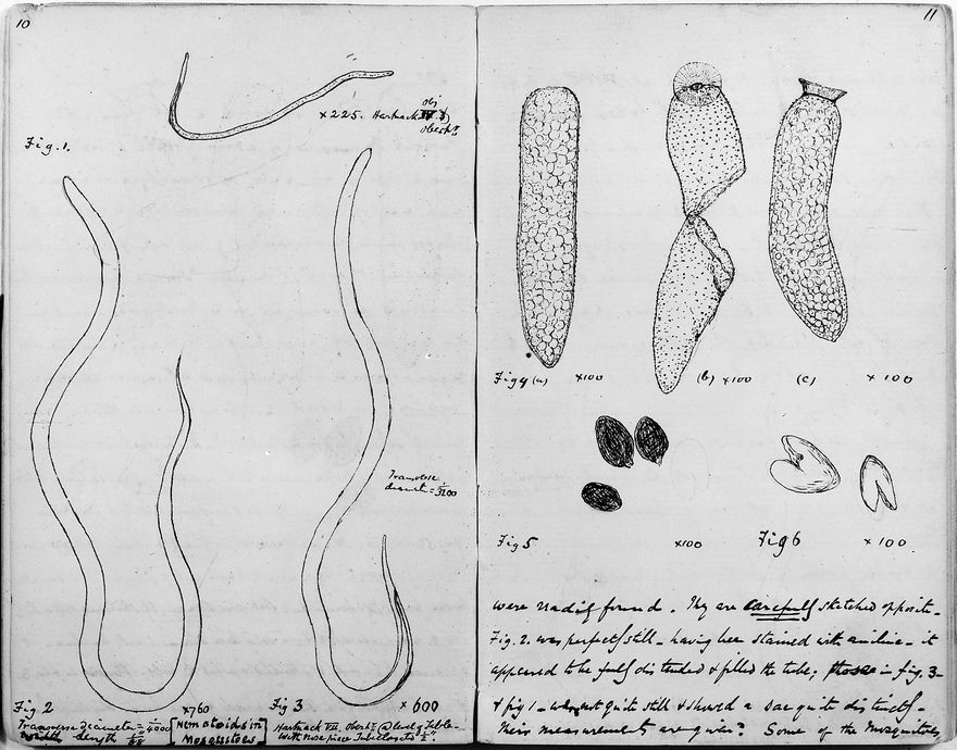 Credit: M0016979: Timothy Richards Lewis's drawing of the embryo filariae in mosquito. Source: Wellcome Collection.
