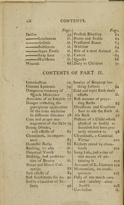 ![TABLE OF CONTENTS. PART I. Page. MEDICAL men, their anxious cares 2 ■ inatten- tion to their com.ort 3 Exercife and Labour 4 Drunkennefs Food and Spiceri«s Recreations Bathing Education of Children Reading Changes of Temperature 20 mifchiefs from, and cure 22 Clothing ib. Fever 25 Ague ib Inflamma. of the Brain 26 ■ ■Kye 27 • Ear, or Ear Ach ib. — Tooth or Tooth Ach 28 Quinfy, or Sore Throat 29 Common Cold ib. Croup 30 Inflammation of the Lungs, Pleurify and Confumption 31 1 Heart 32 —Stomach —Liver Page, Inflam. of Gal]-du£ls 33 Drop-fy 3 5 Jaundice ib. Inflam. of the Bowels 36 '————. Kidneys and Bladder ib. Spitting of Blood 37 Bleeding from the Nofe ib. Piles 38 Fiftula ib. Rheumatic Gout 39 Small Pox ib. Inoculation & Cow Pox 40 Chicken Pox 42 Mealies ib. Scarlet Fever ib. Putrid Sore Throat ib. St. Anthony's Fire 43 Purging 44 Vomitings 45 Flux 46 Colic ib. Ruptures > 47 Apoplexy and Palfy 49 Falling Sicknefs 50 Children Teething 51 Worms 52 Watery Head ib. Fainting 55 Noxious Vapours 56 Drowning and Hanging ib. Intoxication .57](https://iiif.wellcomecollection.org/image/b21145702_0011.jp2/full/800%2C/0/default.jpg)
