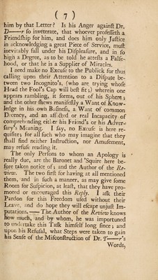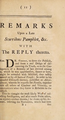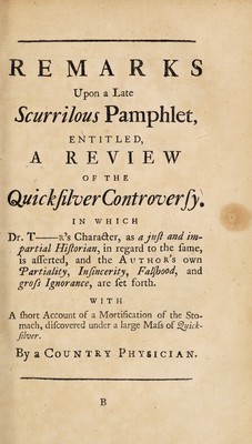 ![PROPHYLACTICUM: O R, A PRESERVATIVE Againfl the MISERABLE CONSEQUENCES OF THE VENOMOUS BITE ~ a v’n O F A MAD - Creature. BEING A Calm Re ply to an Outrageous Libel? INTITLED, R E M ARKS on the Review of the Quickjilver- Cont roverfy. As the Remarks are here reprinted verbatim, and anfwered by Paragraphs feparately in their Order; and as the Conteft arifes foJeJy from Dr. T— —r’s Survey of the Legacy, it will be no improper Piece to bind up with the fecond, or feme future Edition of that fo famous Book. Recommended to the Perulal of a] I who have had, or may have the Curiofity to confolt what has hitherto been published on the Subject of Crude Mercury. By Moore of Moore-Ha It, Who with nothing at ail. Defeats a Dragon of Wantley ; Reviews and Legacies, Were but Geefe and Fricafees; He has eat up all, and left nothing behind : But this Reply, dear Jack, he cannot crack. Which in the Shops you’ll find. L (L N DON: Printed for T. Dover. M.dcc.xxxiv0](https://iiif.wellcomecollection.org/image/b30779066_0001.jp2/full/800%2C/0/default.jpg)