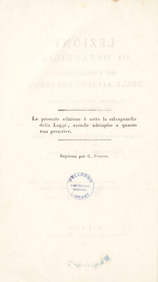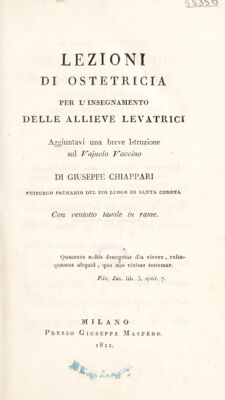 Lezioni di ostetricia per l'insegnamento delle allieve levatrici : Aggiuntavi una breve istruzione sul vajuolo vaccino / [Giuseppe Chiappari].