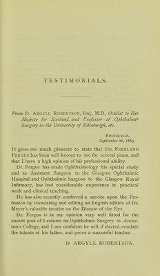 Testimonials in favour of Freeland Fergus ... : candidate for the Chair of Ocular Surgery in Anderson's College Medical School.