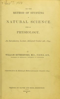 On the method of studying a natural science such as physiology : an introductory lecture, delivered October 9th, 1894 / by William Rutherford.