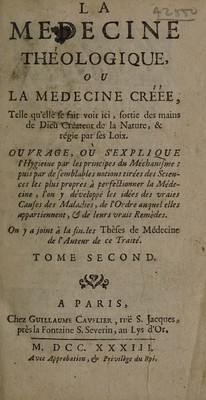 La médecine théologique; ou, La medecine créée, telle qu'elle se fait voir ici, sortie des mains de Dieu ... Ouvrage, ou s'explique l'hygieine [sic] par les principes du méchanisme ... On y a joint à la fin les Thèses de médecine de l'auteur de ce traité ... / [Philippe Hecquet].