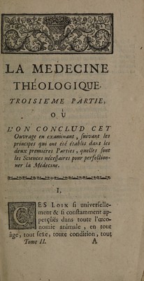 Credit: La médecine théologique; ou, La medecine créée, telle qu'elle se fait voir ici, sortie des mains de Dieu ... Ouvrage, ou s'explique l'hygieine [sic] par les principes du méchanisme ... On y a joint à la fin les Thèses de médecine de l'auteur de ce traité ... / [Philippe Hecquet]. Source: Wellcome Collection.