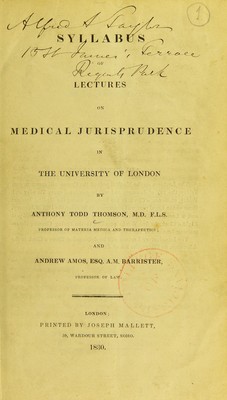 Syllabus of lectures on medical jurisprudence in the University of London / By Anthony Todd Thomson and Andrew Amos.