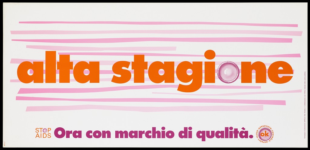 Credit: The words 'alta stagione' [high season] incorporating a pink condom between pink vertical lines; an advertisement for safe sex and the trademark 'OK' quality seal awarded to brand condoms; an Italian version of a series of safe sex posters from a 'Stop AIDS' campaign by Aiuto AIDS Svizzero in collaboration with the Federal Office of Public Health. Colour lithograph. Source: Wellcome Collection.